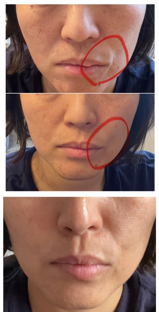 私が気になっていたのは特に口角の横にある深い縦皺だったのですが、だいたい週2〜3回のクラスで毎回実演していたせいか、現段階では目立たなくなっています。