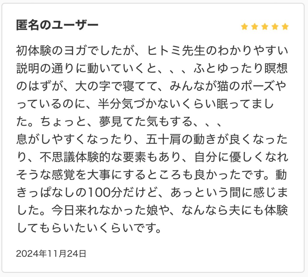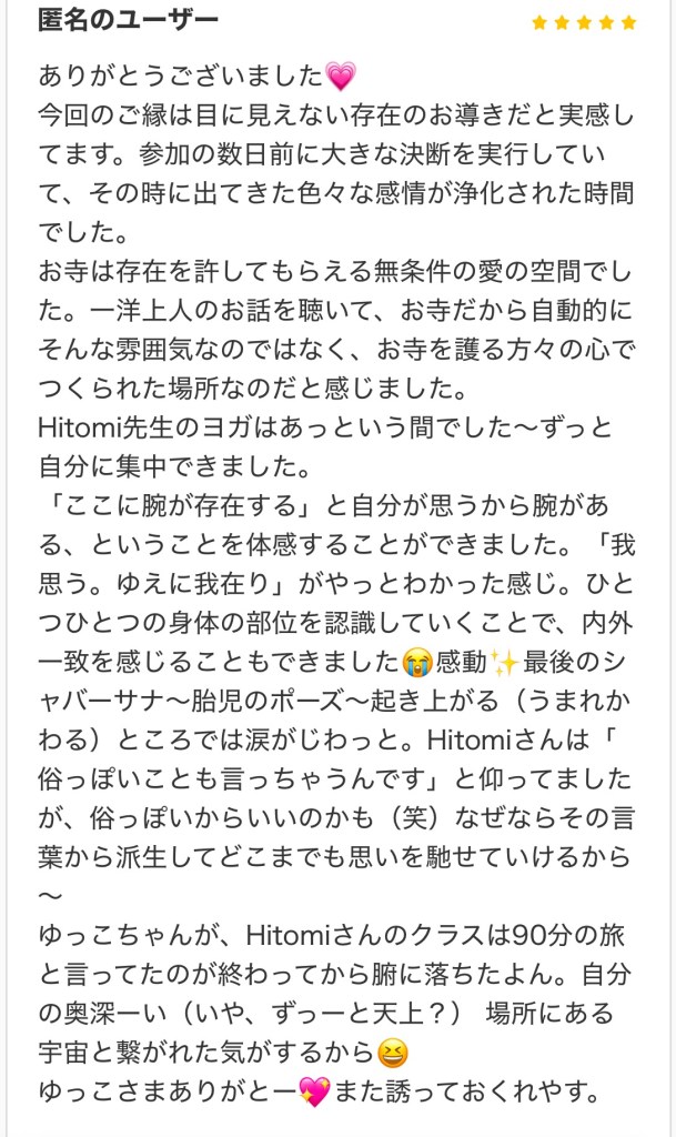 どれも私が今までヨガの練習を通して受け取ってきた恩恵の数々で、自身のクラスを通じて、そのバトンをお渡しできたことにホッとしております。