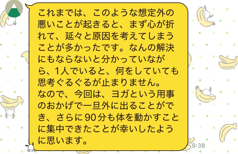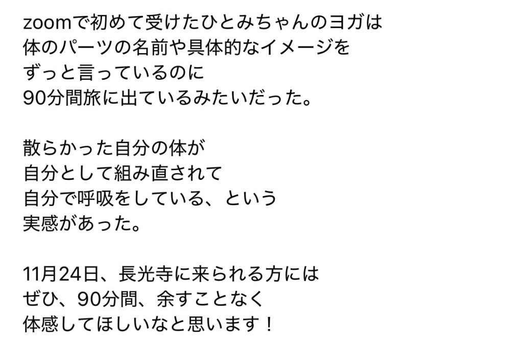 この感想を書いてくれたのは高校時代の同級生。省略した部分にもあるとおり、アマテルヨガの生徒さんの里帰り出産にあたり、地元の長野で助産師をしている彼女を紹介したことがふたたび連絡を取り合うきっかけになり受講してくれました。
