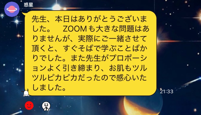 普段は海外にいらっしゃることが多く、zoom参加がメインの方ですが、たまたま日本に長めに滞在されている間に、週2ペースでお越しいただいた際のご感想です。