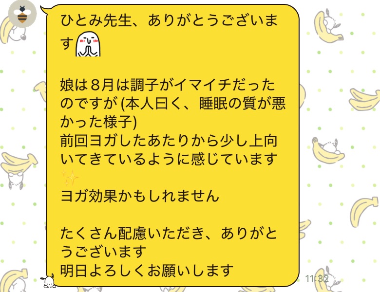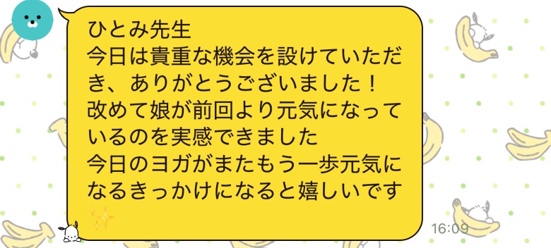 新しい一歩を踏み出すきっかけに、ヨガが一助となっているかもしれないこと、とても光栄です。親子のコミュニケーションの手段として、ぜひこれからも利用していただけたらと願っています。