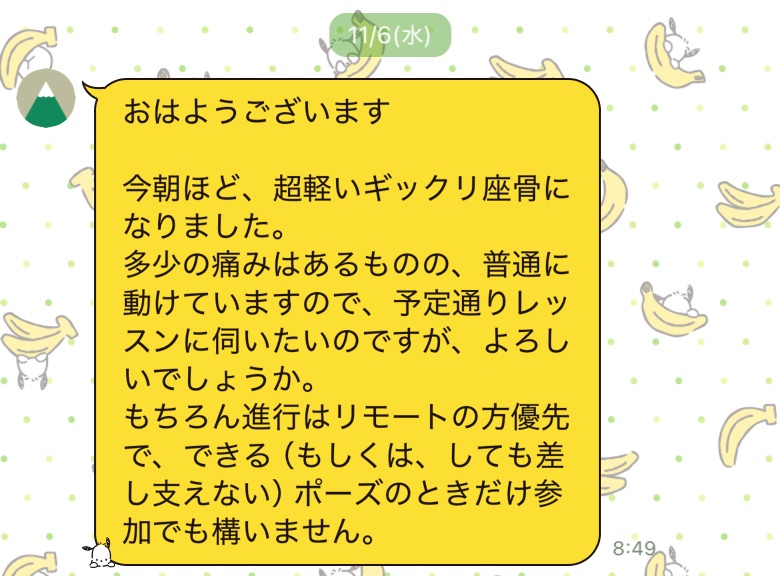 ヨガ当日の朝の身体の痛み、出席悩んでしまう気持ちわかります。痛くて起き上がれない、とかであれば即病院に行ってくださいね!